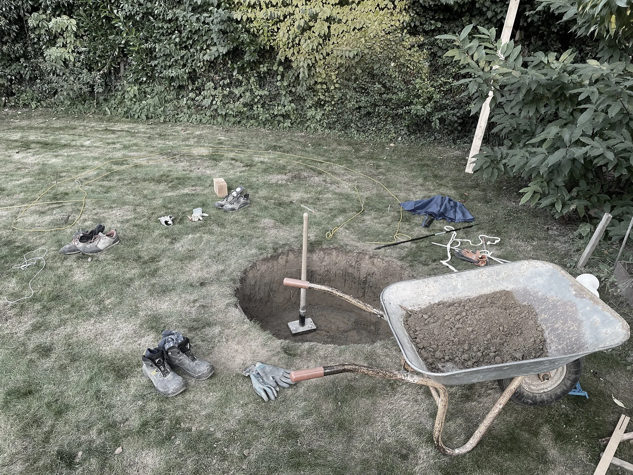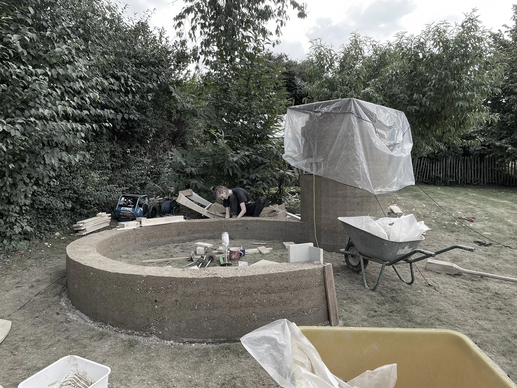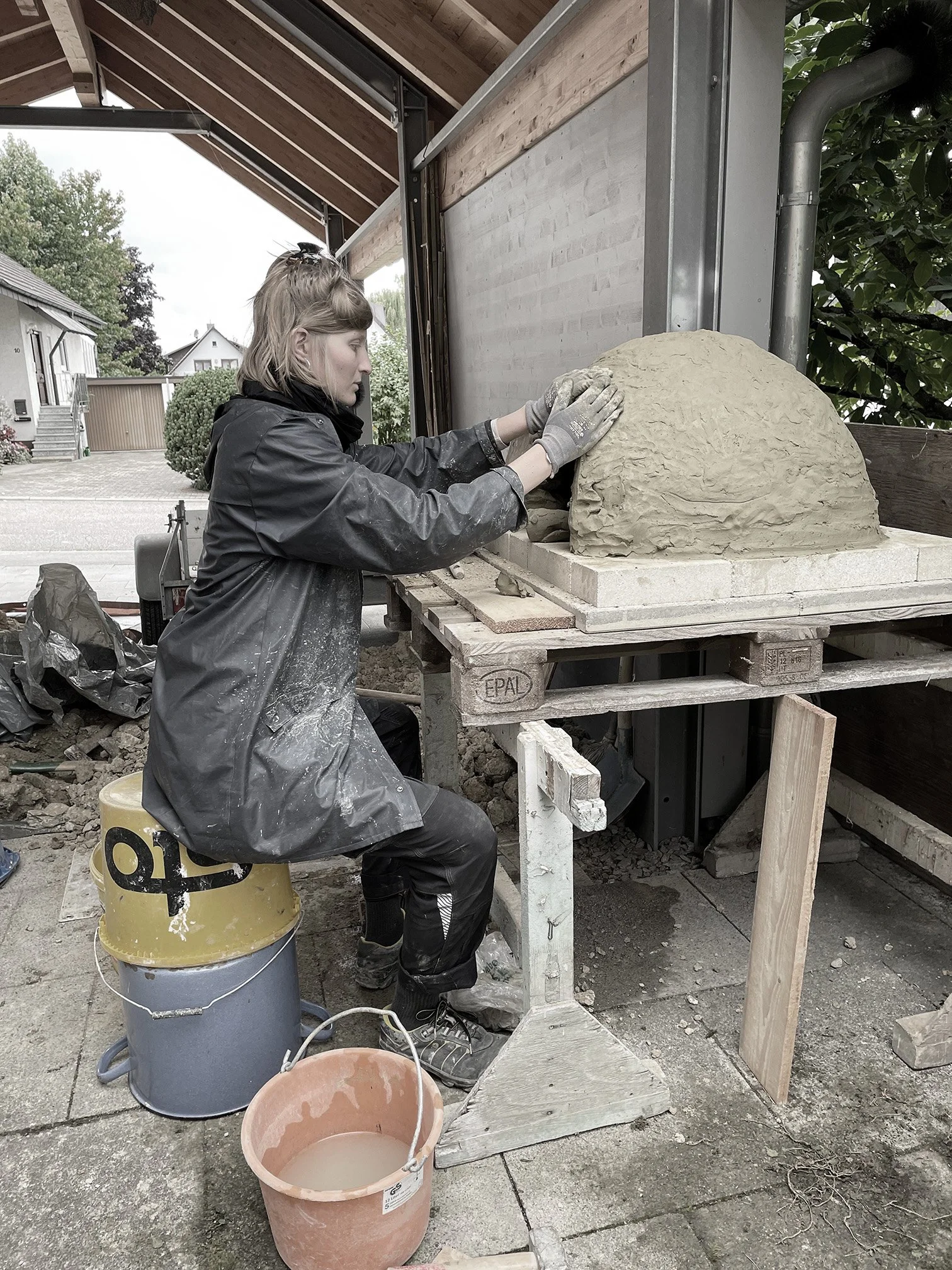 Für die Ausführung der anspruchsvollen Geometrie des Ofens wurde eine Tonnenschalung entworfen, die der Konstruktion eines Weinfasses ähnelt, um dem extremen Druck beim Stampfen Stand halten zu können. Die an den Ofen anschliessende Sitzbank wurde mit Hilfe einer wandernden Schalung in fünf Segmenten errichtet.